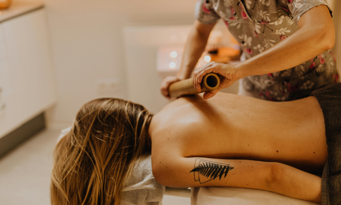 Wood therapy using sculpted tools to stimulate circulation, tone tissue and aid lymphatic drainage for improved body contour.